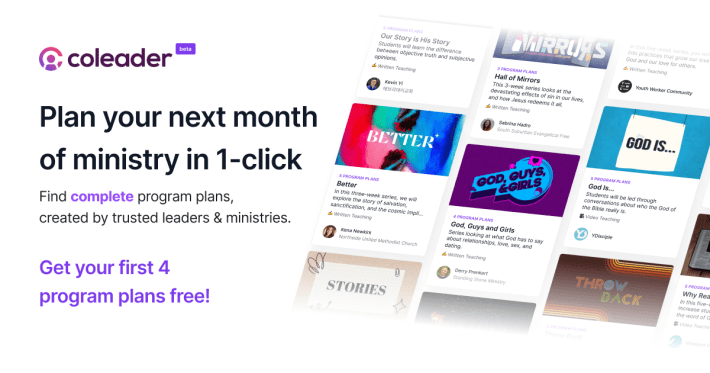 Coleader is a FREE tool you can use to prepare a dynamite program for your student ministry. But if you need some help, you can subscribe or use credits to purchase an entire series of programs.